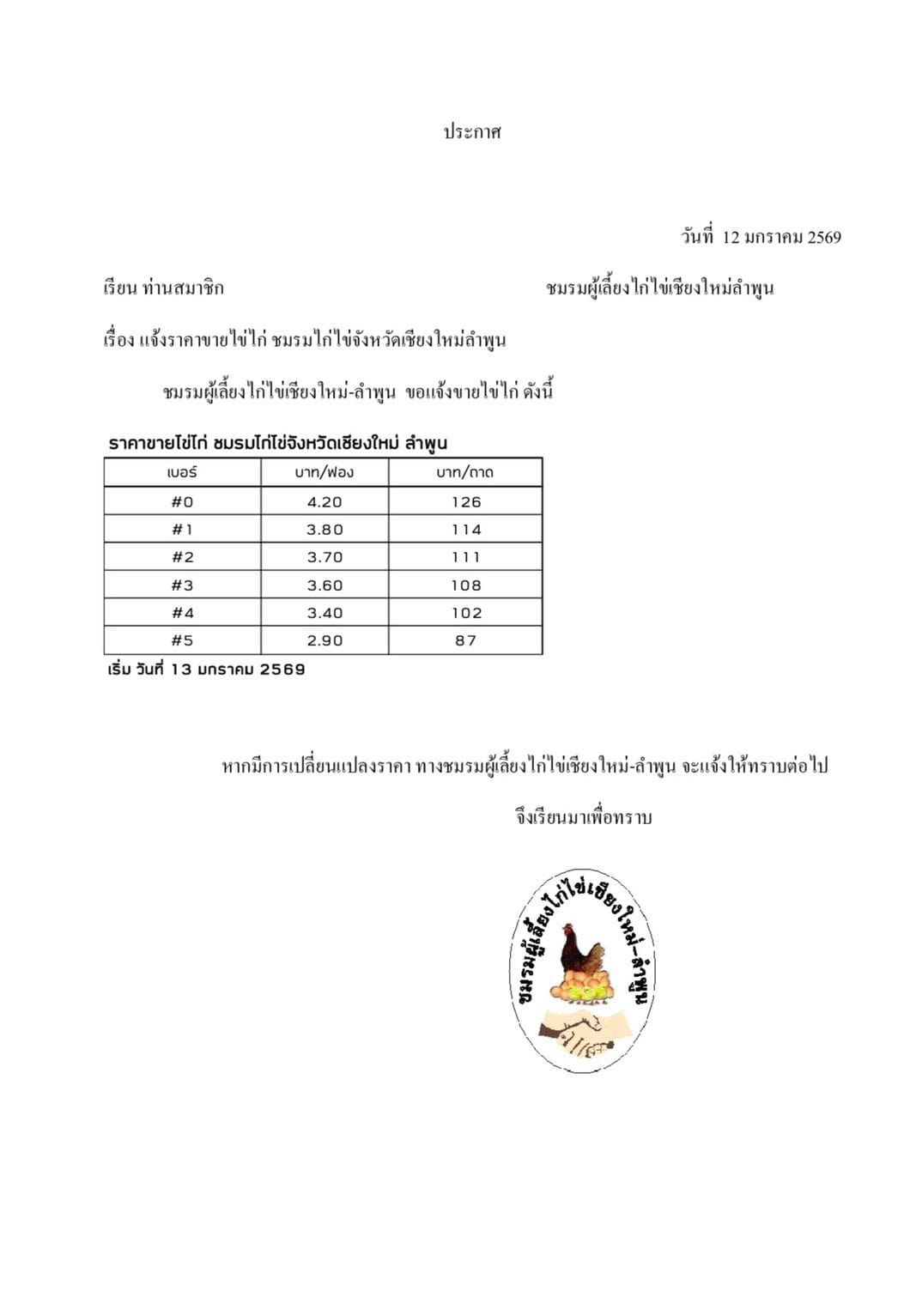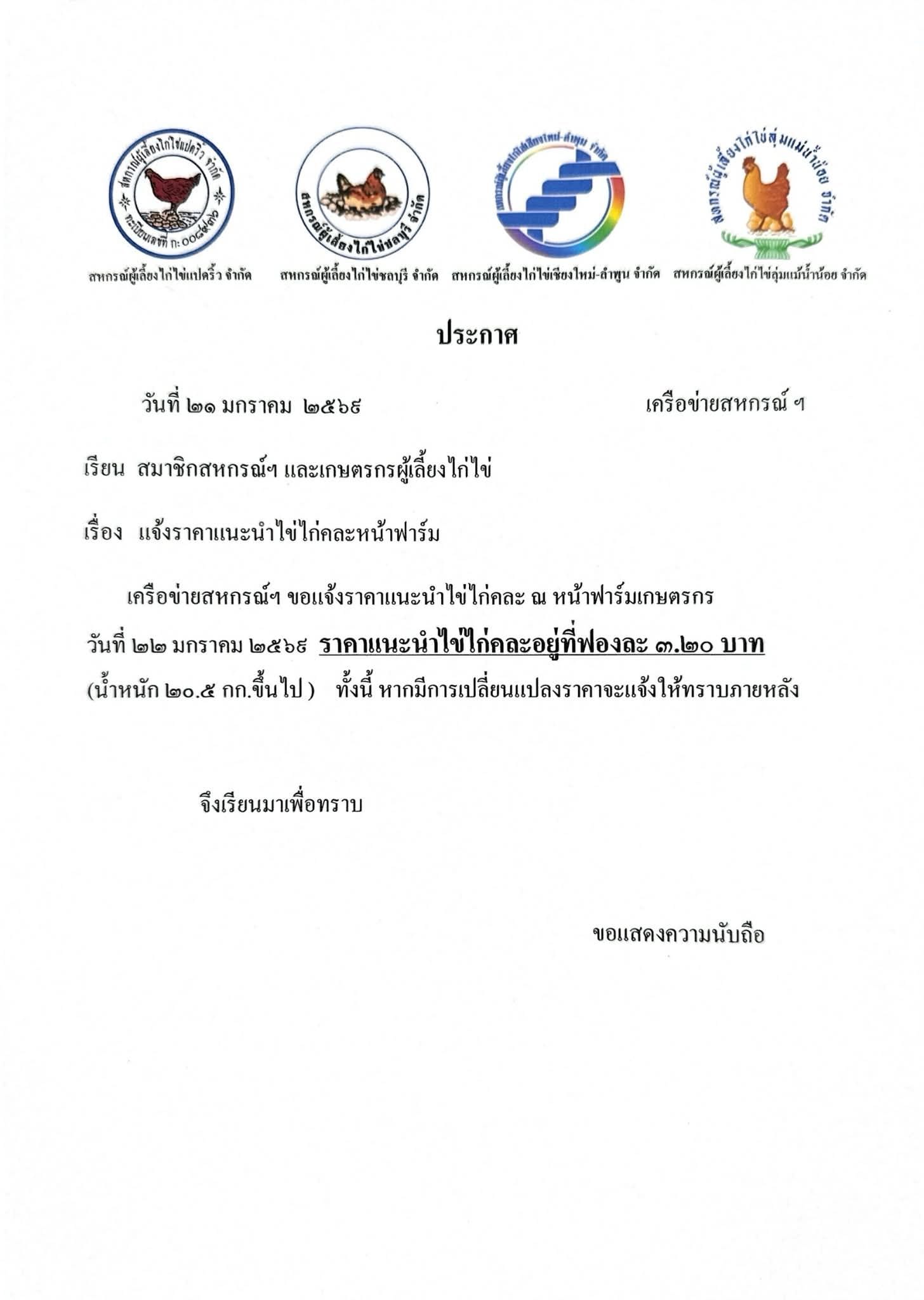 ราคาไข่วันที่ 22 มกราคม 2569 ราคาประกาศ 3.20
